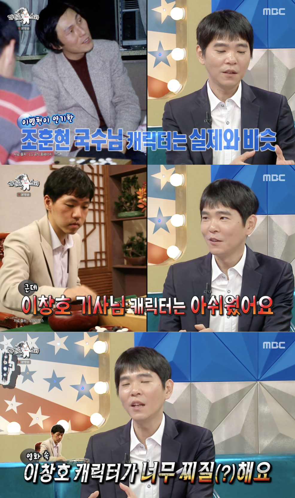 이세돌은 바둑 영화 '승부'에 대해서도 솔직한 평가를 내놨다. 그는 "조훈현 국수님 캐릭터는 어느 정도 살린 것 같다. 그런데 이창호 기사님 캐릭터는 너무 아쉬웠다. 캐릭터가 너무 찌질하다"라며 직설적으로 지적했다.