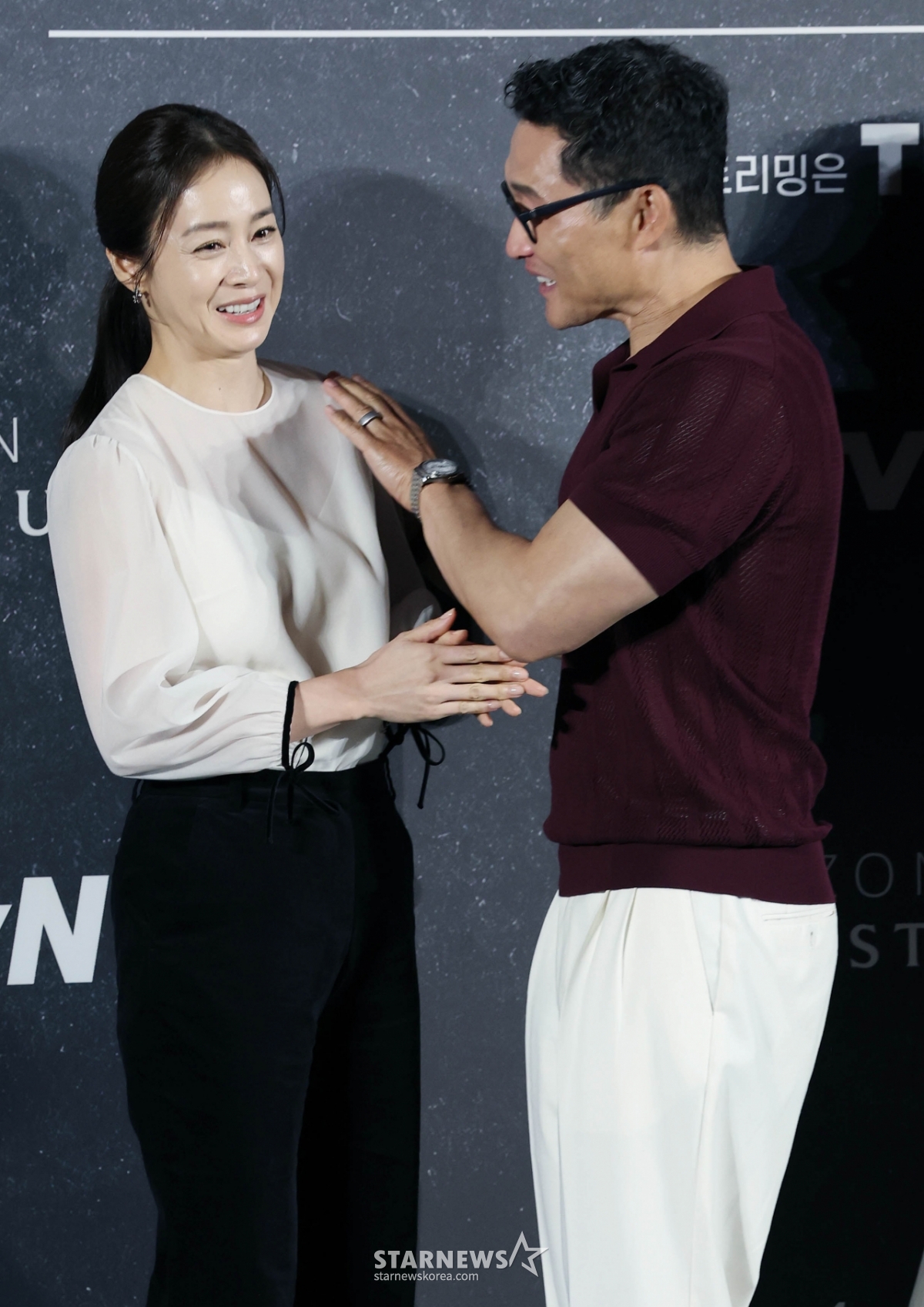 배우 김태희, 대니얼 대 킴이 21일 오전 서울 CGV용산아이파크몰에서 진행된 아마존 오리지널 시리즈 '버터플라이' 기자간담회에 참석해 포즈를 취하고 있다.