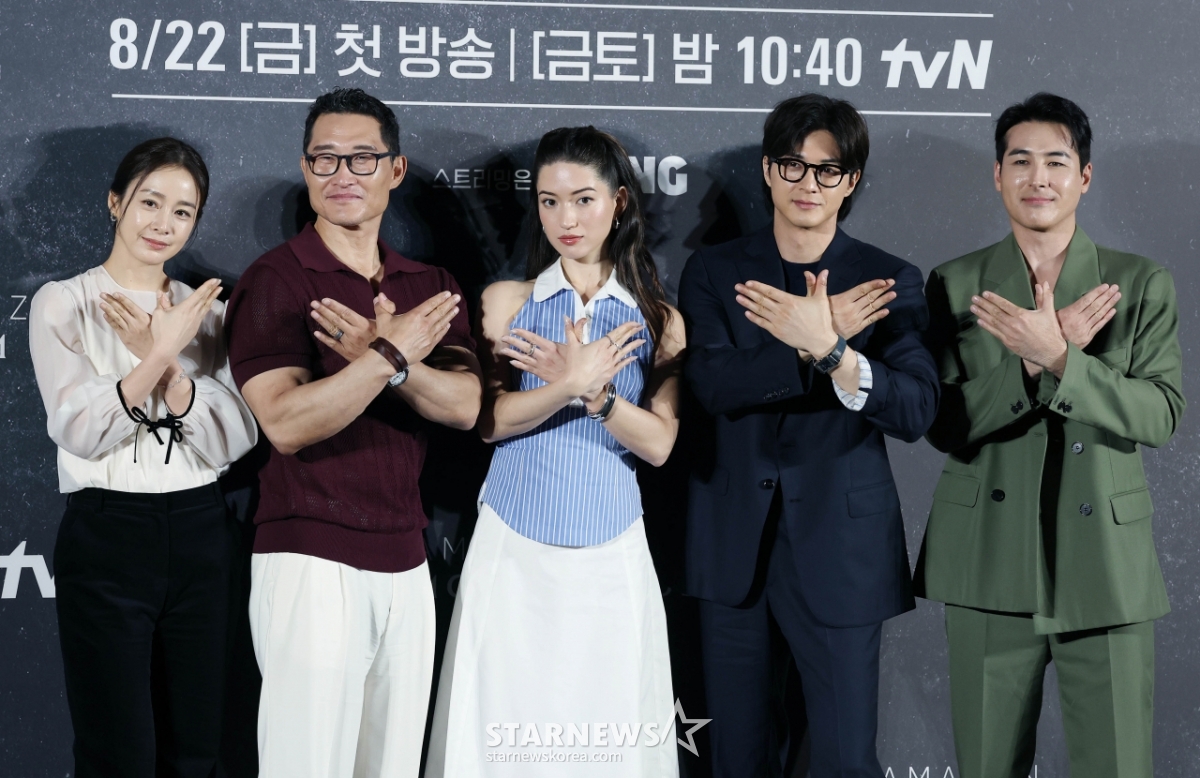 배우 김태희, 대니얼 대 킴, 레이나 하디스티, 김지훈, 션 리차드가 21일 오전 서울 CGV용산아이파크몰에서 진행된 아마존 오리지널 시리즈 '버터플라이' 기자간담회에 참석해 포즈를 취하고 있다.