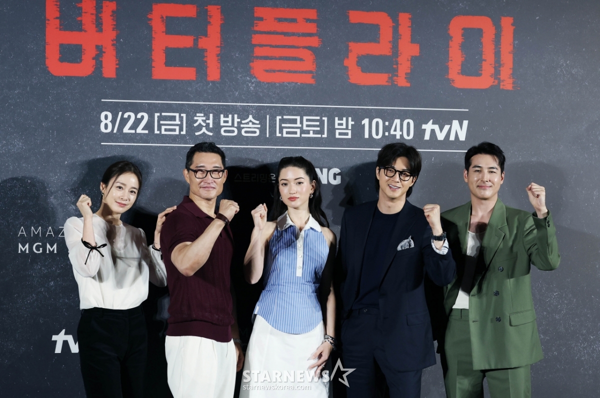 배우 김태희, 대니얼 대 킴, 레이나 하디스티, 김지훈, 션 리차드가 21일 오전 서울 CGV용산아이파크몰에서 진행된 아마존 오리지널 시리즈 '버터플라이' 기자간담회에 참석해 포즈를 취하고 있다.