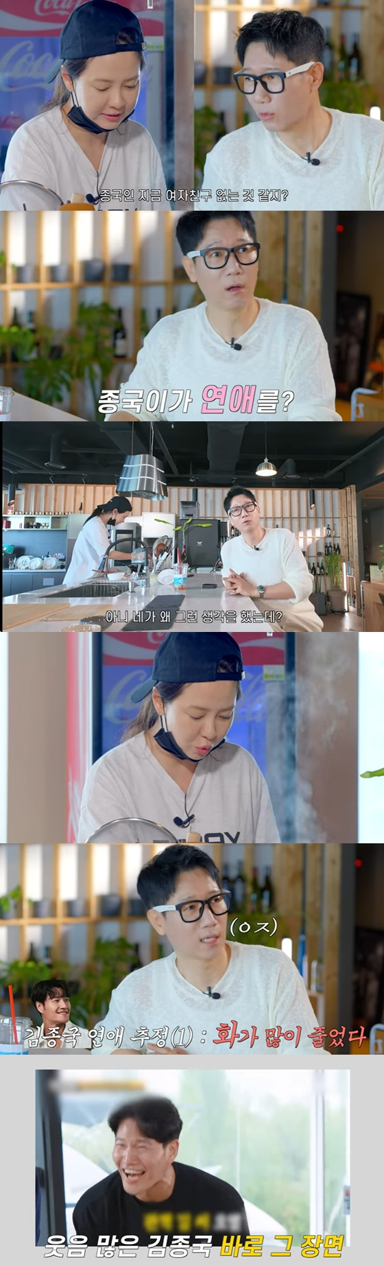 이에 지석진은 "네가 왜 그런 생각을 했는데"라고 되물었고, 송지효는 김종국의 연애 추정 이유로 "요즘에 화가 많이 줄고 웃음이 많아졌다"라고 꼽았다.