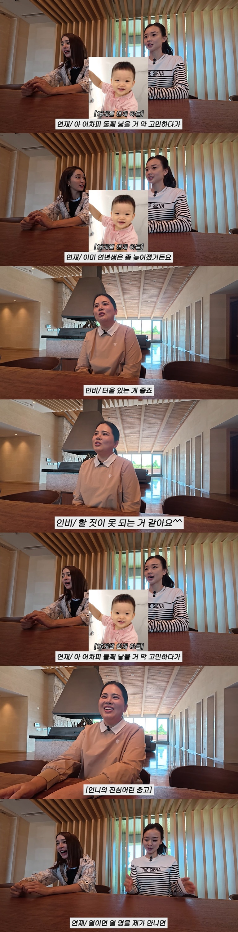 박인비는 "근데 연년생은 진짜 할짓이 못 되는 거 같다. 낳고 나서야 하는 말이지만"이라고 털어놓았다. 이에 손연재가 "저도 어차피 둘째 낳을 거 막 고민하다가 이미 연년생은 좀 늦어졌다"라고 하자 박인비는 "그냥 낳지마"라며 충고했다.