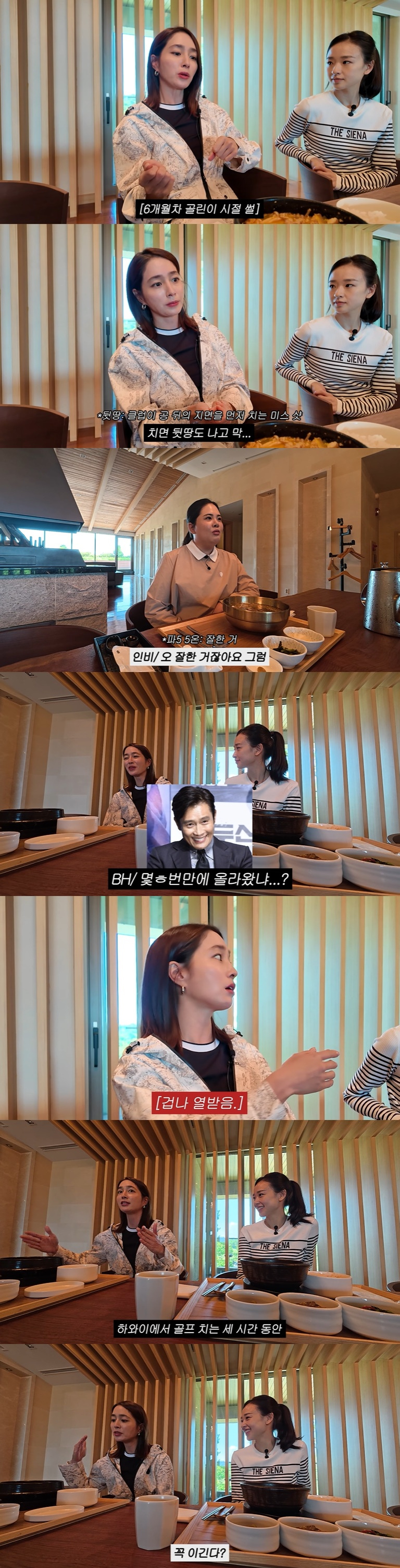 박인비는 이민정에게 "남편분도 골프 좋아하냐"라고 물었고, 이민정은 "남편이 치라고 해서 쳤다. 6개월 초보 때 치면 뒷땅도 나고 그랬는데, 파5를 5온을 했다"고 했고, 박인비가 "잘한 거 아니냐"고 했지만 이민정은 "한 번 퍼덕였는데 (이병헌이) '몇 번 만에 올라왔냐'라고 하더라. 하와이에서 치는 세 시간 동안 말 한 마디 안 하고 골프만 쳤다. '내가 너를 빠른 시간 안에 이기리라' 하고서 2년 반 만에 이기고 오빠를 놀리기 시작했다"고 말했다.