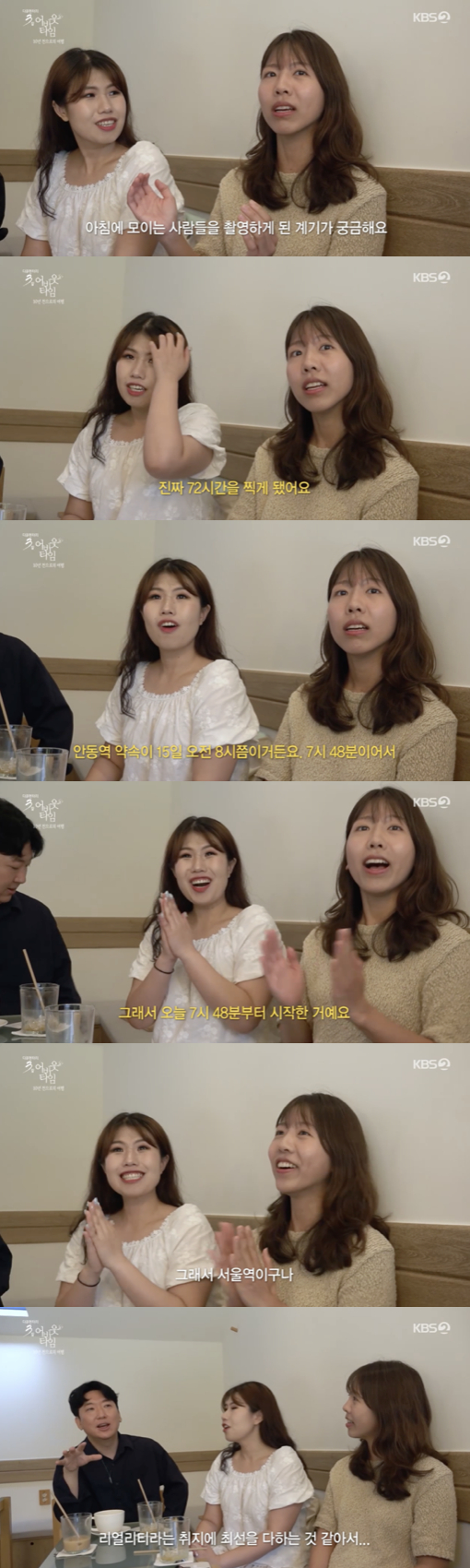 이날 제작진은 서울역의 한 카페에서 출근 전 모임을 갖는 '모닝 커피 클럽' 비회원 커뮤니티를 촬영했다. 제작진에게 "왜 서울역에서 촬영을 시작했느냐"는 질문이 나오자 "안동역 약속 시간이 15일 오전 7시 48분이다. 그래서 오늘 그 시각부터 카메라를 켜게 됐다. 만남이 성사될지는 모르겠지만 72시간의 기록을 시작했다"고 설명했다.