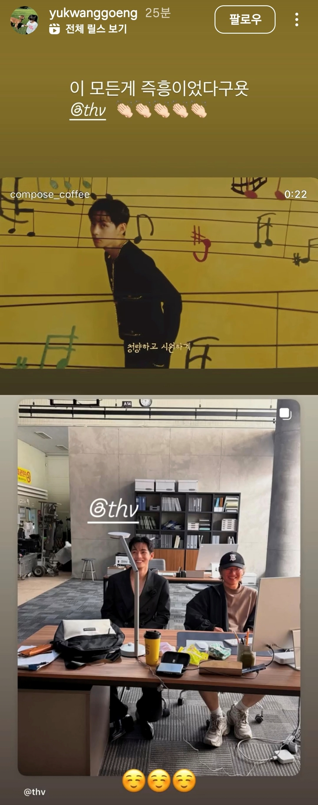 뷔가 홍보모델을 맡은 컴포즈커피 캠페인 영상을 촬영한 CF감독 유광굉은 자신의 인스타그램에 "이 모든 게 즉흥이었다구욧"라는 글과 함께 촬영 현장과 뷔와 나란히 찍은 사진을 올렸다.