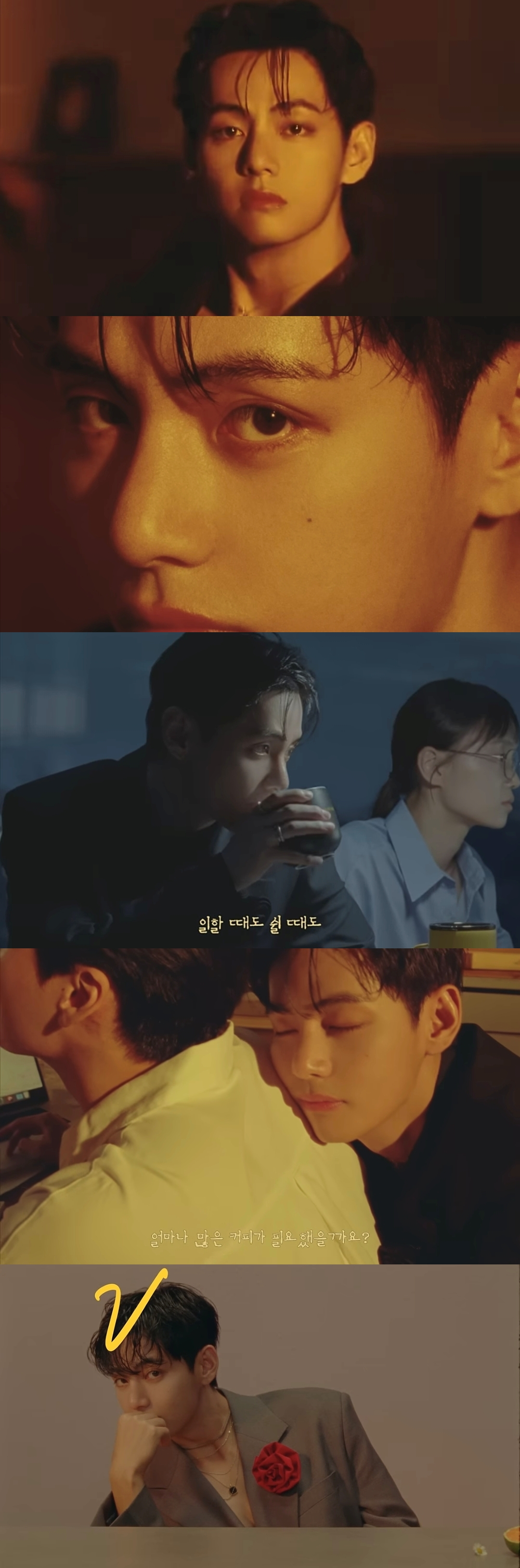 '커피를 커피답게' 캠페인 영상은 평범한 일상 속 커피와 함께하는 순간들을 뷔의 따뜻한 시선으로 담았다. 캠페인 영상에서 뷔는 고독한 현대인의 모습부터 한 장의 커피를 마시며 여유로운 분위기를 즐기는 모습까지, 다양한 표정으로 연기하며 다채로운 매력을 발산했다.