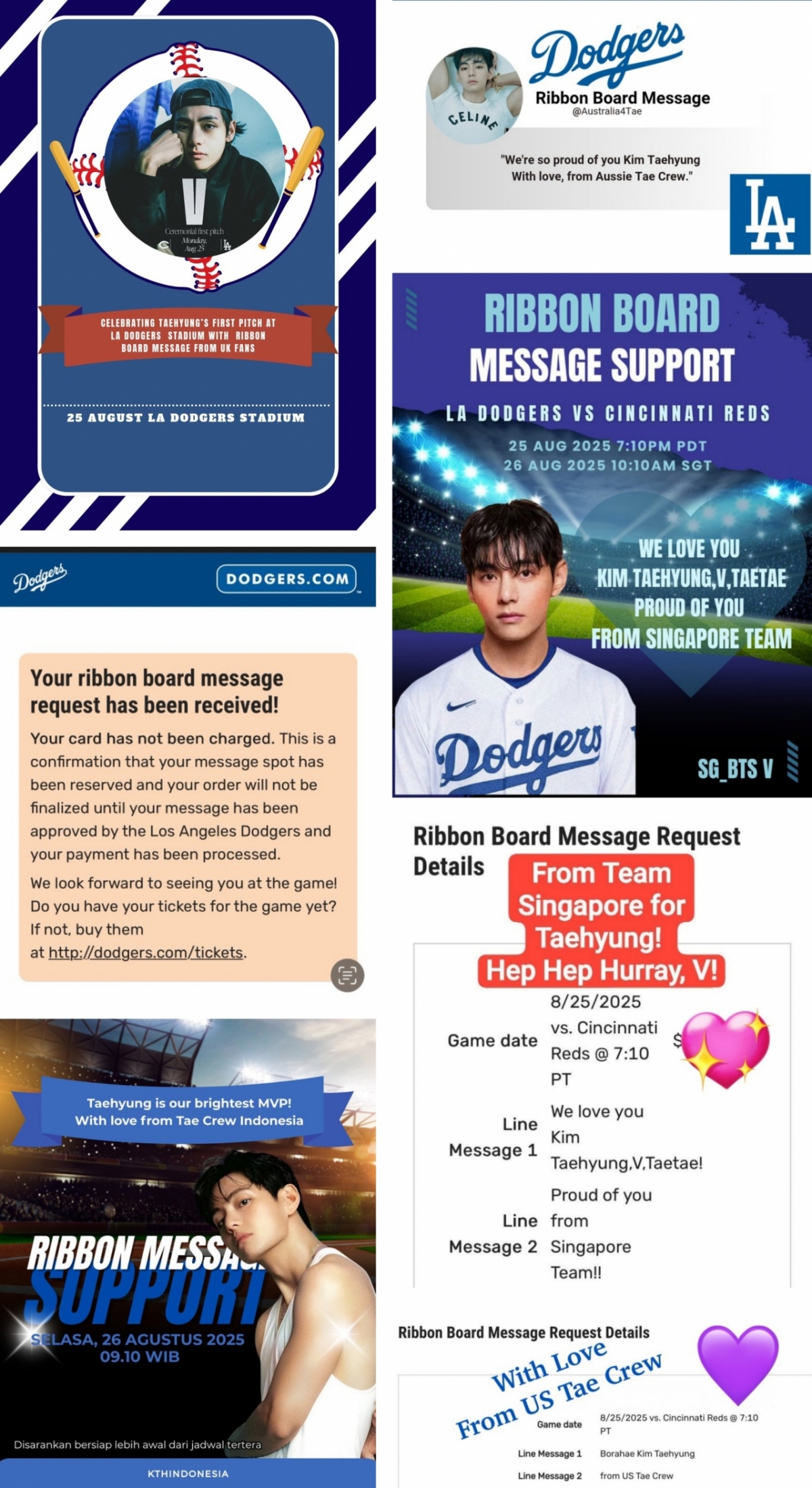영국 팬베이스 'VUK' 호주 팬베이스 'BTS V Australia' 싱가포르의 'Taehyung Singapore'와 'Tae Singapore', 인도네시아 팬베이스 'Taehyung Indonesia'를 비롯해 'TAEHYUNG TUESDAY' 'TAE Stream SPAIN'도 리본 보드 메시지 광고를 공지했다.