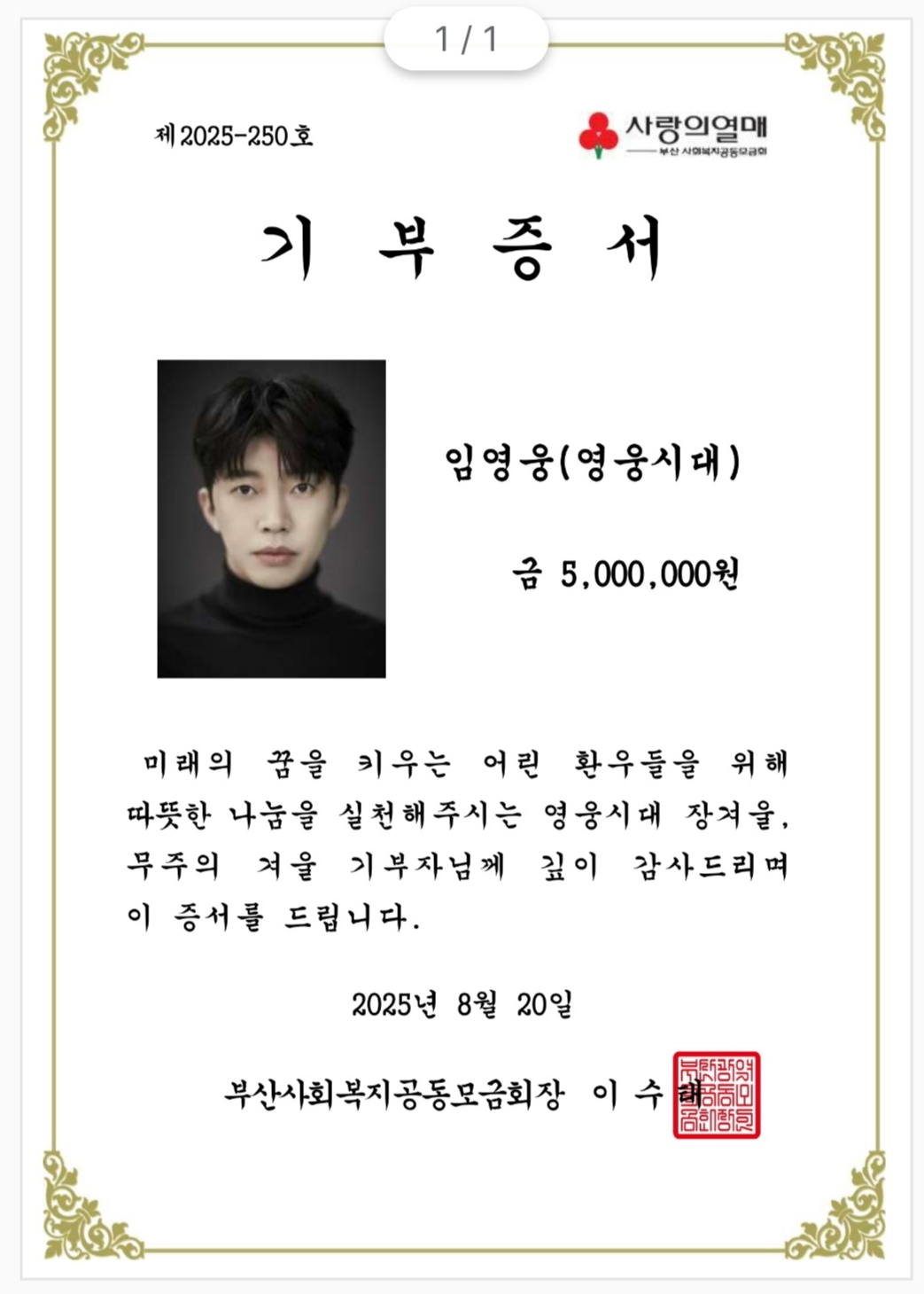 임영웅 팬클럽 영웅시대 장겨울 회원은 임영웅 정규 2집 발매를 기념해 8월 20일 사랑의열매 부산사회복지공동모금회 (회장 이수태·부산사랑의열매)에 성금 500만 원을 전달했다.