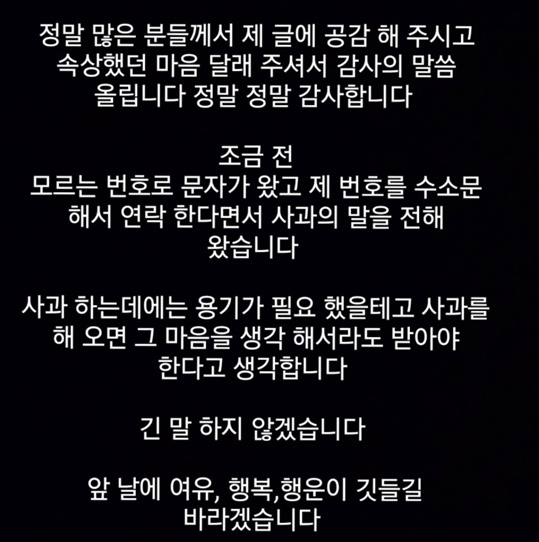 장윤정은 "사과 하는데에는 용기가 필요했을테고 사과를 해오면 그 마음을 생각해서라도 받아야 한다고 생각합니다"라며 "긴 말 하지 않겠습니다. 앞날에 여유, 행복, 행운이 깃들길 바라겠습니다"라고 대인배다운 모습을 보였다.