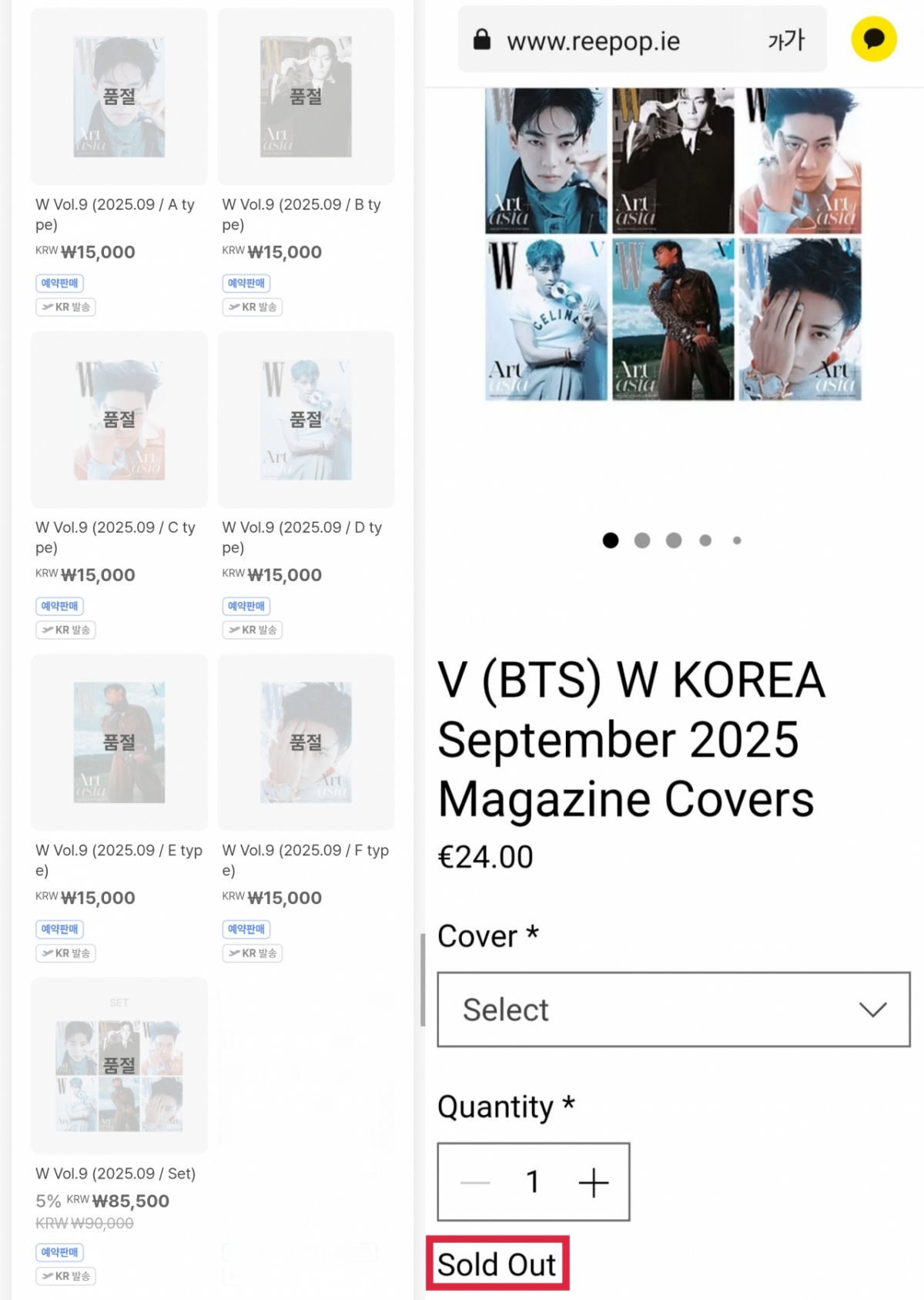 영국 및 유럽 전역에 공식적으로 K팝 앨범, 포토카드, 매거진 등을 판매하는 K팝 콘텐츠 판매플랫폼 리팝(REEPOP)에서도 발매 공지 10일 만에 W코리아 매거진 6종이 품절됐다고 알렸다.