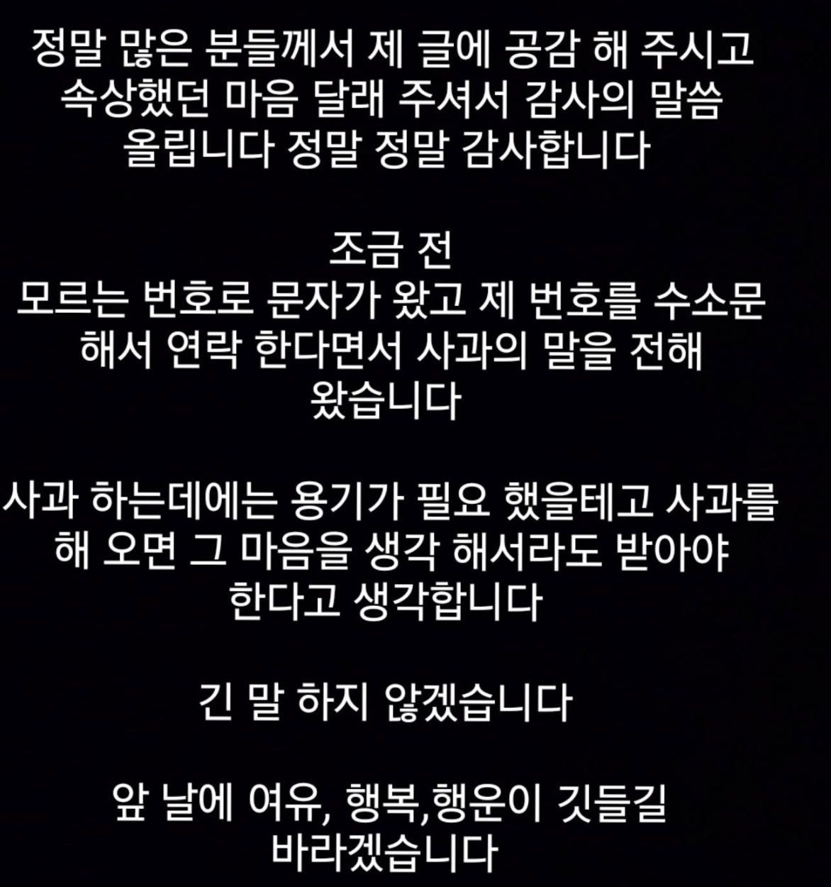 이어 "사과하는 데는 용기가 필요했을 테고 사과를 해오면 그 마음을 생각해서라도 받아야 한다고 생각합니다"라며 "긴말 하지 않겠습니다. 앞날에 여유 행복 행운이 깃들길"이라고 덧붙였다.