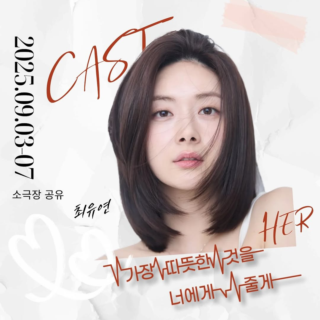최유연은 이번 작품에서 핵심 인물인 '그녀' 역을 맡는다. 배우 김재아는 '그녀의 언니(Her Sister)' 역을, 배우 김휘욱은 'HE', 배우 김혜성은 'HUGO' 역을 각각 맡아 인간과 기술, 그리고 관계에 대한 다층적인 이야기를 펼쳐낸다. 네 명의 배우들은 각기 다른 관점에서 AI 시대를 살아가는 인물들의 고뇌와 선택을 섬세하게 표현할 예정이다.