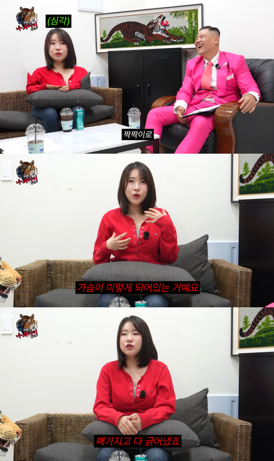 또 "그게 너무 심해서 넥타이로 묶고 다녔다. 결국 가슴을 째고 (넣은) 필러를 다 긁어냈다. 이후 보형물을 넣는 가슴 수술을 한 것"이라고 털어놨다.