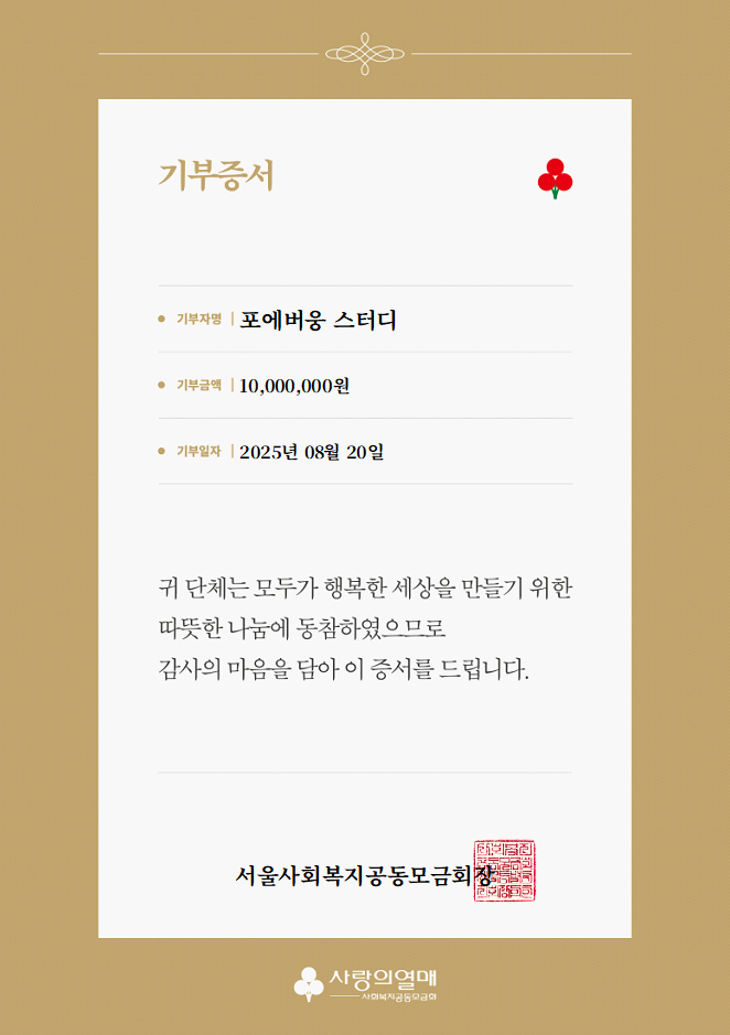 임영웅 팬클럽 '포에버웅 스터디'는 임영웅 정규 2집 발매를 기념해 8월 20일 사랑의열매 서울사회복지공동모금회(회장 김재록, 이하 서울 사랑의열매)에 1000만 원을 기부했다.