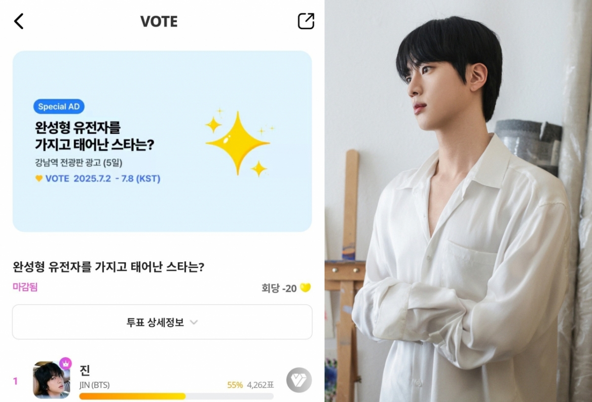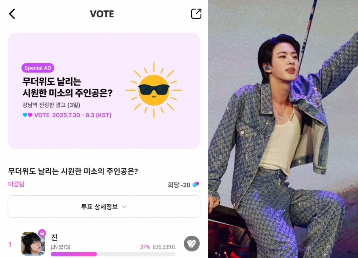 여기에 더해, 진은 7월 30일부터 8월 3일까지 진행된 '무더위도 날리는 시원한 미소의 주인공' 투표에서도 1위를 차지했다. 진은 무려 83만 6339표(득표율 37%)를 획득하며 팬들의 열렬한 지지를 받았다. 리워드로는 강남역 전광판 3일 광고가 제공된다. 진 특유의 청량하고 깨끗한 미소는 여름 무더위마저 잊게 만드는 치유의 힘으로, 팬들에게는 그 자체로 가장 큰 에너지와 위안이 되고 있다.