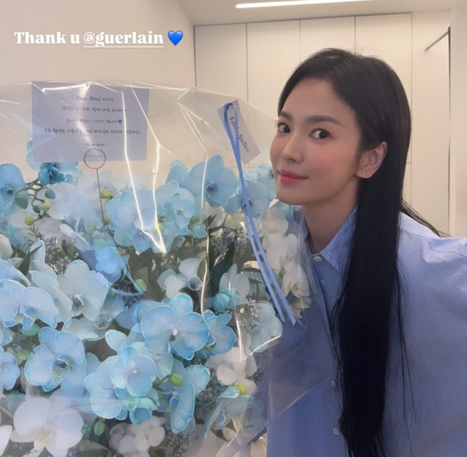 사진엔 송혜교가 몸집보다 큰 꽃다발을 들고 있는 모습이 담겼다. 특히 그는 40대 나이가 믿기지 않는 꽃미모를 과시, 감탄을 자아냈다.
