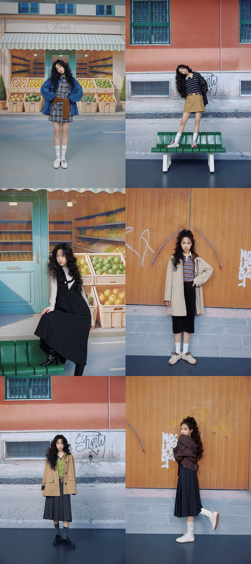 또한 그녀는 다양한 아우터들을 센스있는 컬러조합으로 매치하여 올 가을 따라하고 싶은 스타일링을 선보였다. 하프 기장의 트렌치 코트에 스트라이프 카라 티셔츠와 팬츠를 착용하거나 브라운과 그린이 레이어드된 가디건에 플레어 스커트를 착용해 가을 시즌 빠질 수 없는 코트 패션을 완성했다. 또한 그녀는 바람막이에 스커트를 매치한 패션으로 환절기 시즌 참고하면 좋은 스타일링까지 보여주었다.