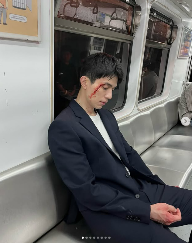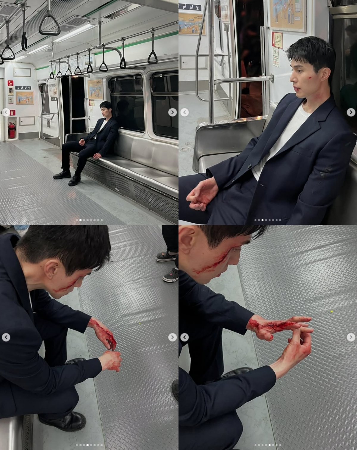 사진 속 이동욱은 눈썹부터 볼까지 깊이 패인 새빨간 상처를 입은 채 지하철에 앉아 있는 모습. 두 팔까지 피범벅이 된 이동욱은 허공을 바라보며 손가락을 만지작거리고 있다. 다행히 이는 '착한 사나이' 속 하나의 장면으로 작품을 향한 그의 넘치는 열정이 눈길을 끈다.