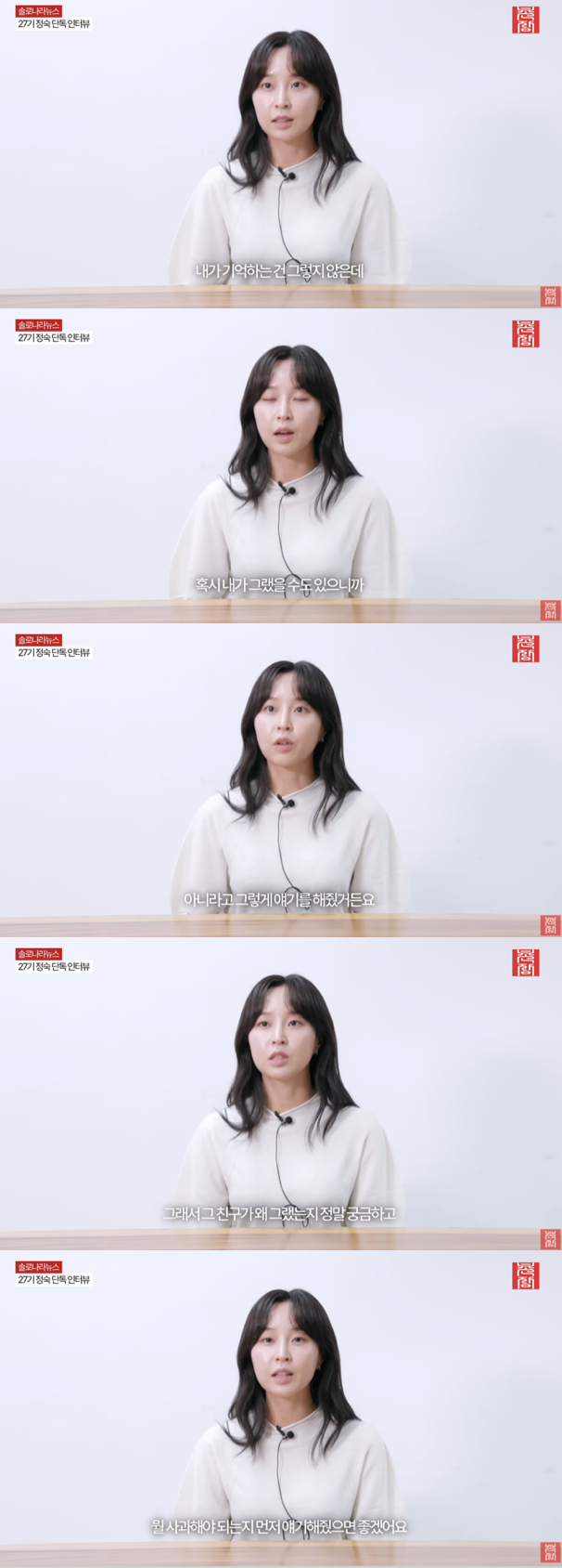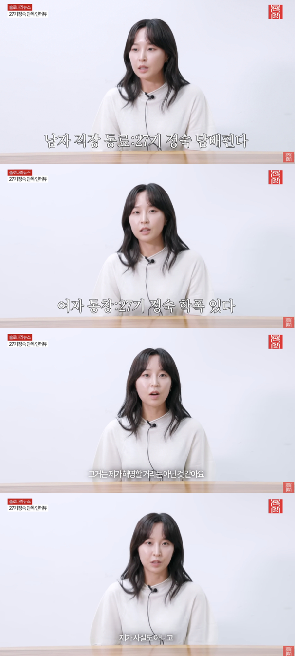 29일 유튜브 채널 '촌장엔터테인먼트TV'에는 "[솔로나라뉴스] 흡연? 학폭? 모든 논란 종식시키러 온 27기 정숙"이라는 제목의 영상이 공개됐다. 해당 영상에는 정숙이 직접 출연해 그동안 제기된 오해와 루머에 대해 솔직한 입장을 밝혔다.
