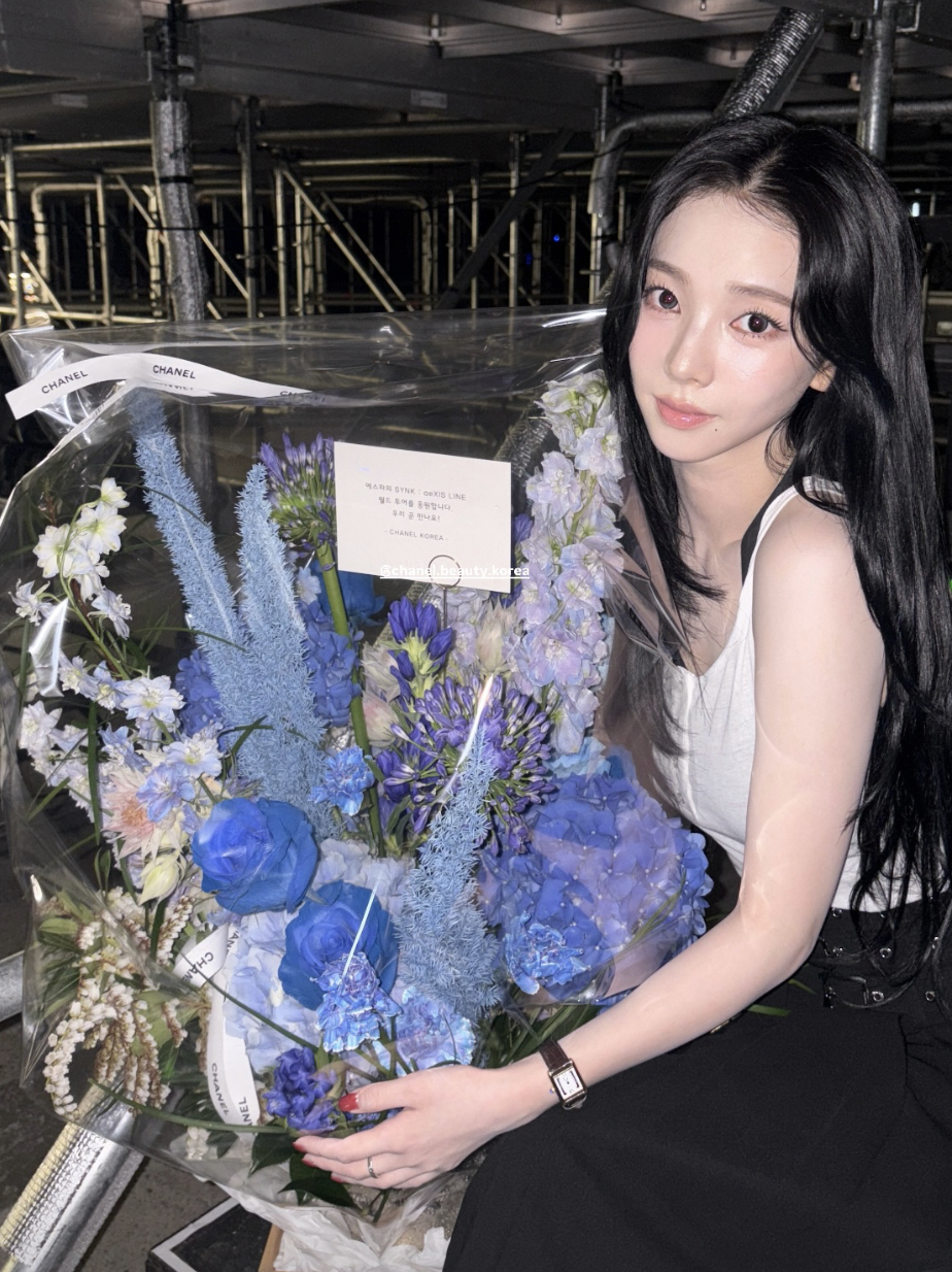 공개된 사진 속 카리나는 콘서트를 마친 뒤 가족들에게 받은 거대한 꽃다발을 안고 눈물이 터질 듯한 표정을 짓고 있다.