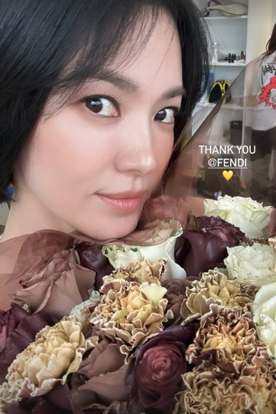 공개된 사진 속 송혜교는 한 브랜드에서 보내 준 꽃다발을 들고 카메라를 바라보고 있다. 브라운톤의 꽃다발을 든 송혜교의 얼굴도 가을을 맞은 브라운톤 메이크업을 한 모습.