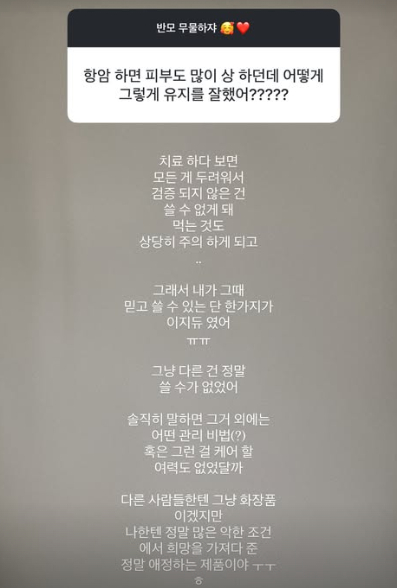 또한 이솔이는 "치료 하다보면 모든 게 두려워서 검증되지 않은 건 쓸수 없게 돼. 먹는 것도 주의하게 되고"라고 전했다.