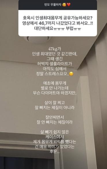 이솔이는 자신의 인생 최대 몸무게에 대해서는 47kg라고 답하고 "그때 생긴 허벅지 셀룰라이트가 아직도 심해서 정말 스트레스"라며 "살이 잘 안찌면서 잘 안빠지는 체질이라 살빼기 쉽지 않은 케이스"라고 덧붙였다.