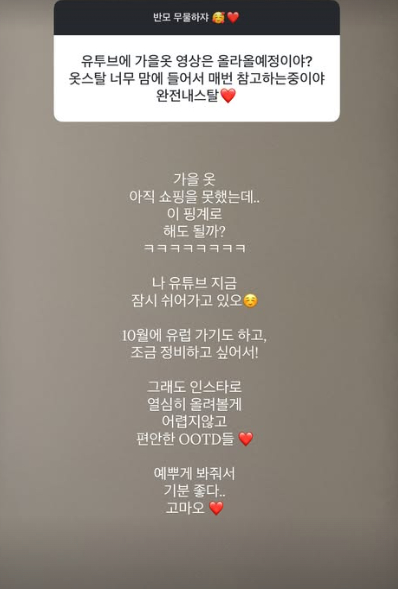 이와 함께 이솔이는 "나 유튜브 지금 잠시 쉬어가고 있어"라며 "10월에 유럽 가기도 하고 조금 정비하고 싶어서"라고 전했다.