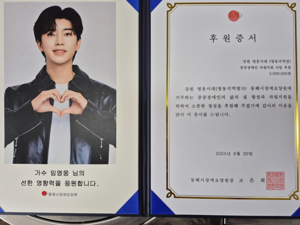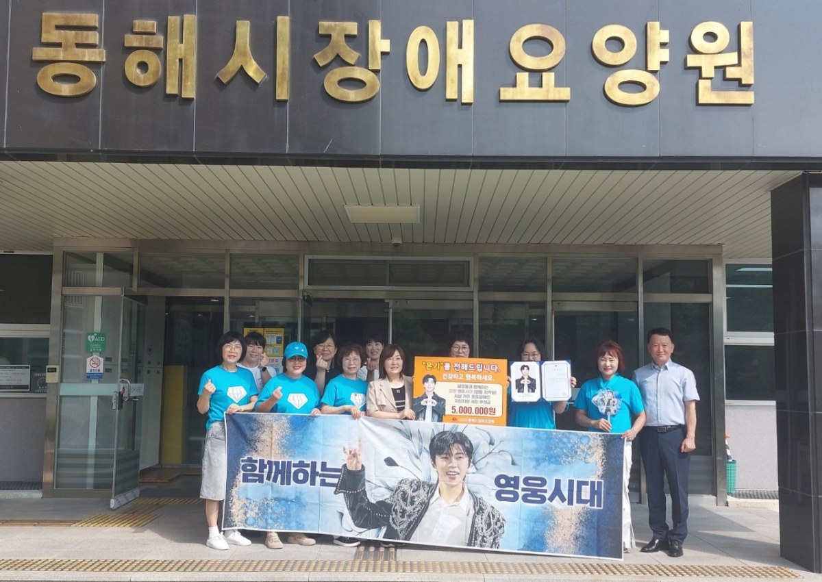 임영웅 팬클럽 강원 영웅시대 영동지역방(동해, 삼척)은 8월 30일 강원 동해시 중증 장애인거주 시설인 사회복지법인인애원복지재단 동해시장애요양원(원장 조은희)에 500만 원을 기부했다.