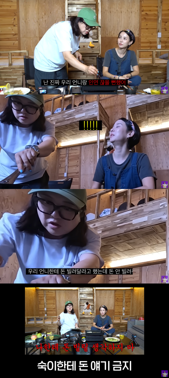 그러자 김숙은 "네가 착한 거다. 나는 우리 언니랑 진짜 인연 끊을 뻔했다. 내가 돈 빌려달라고 했는데 언니가 돈을 안 빌려줘서"라고 밝혀 웃음을 자아냈다.