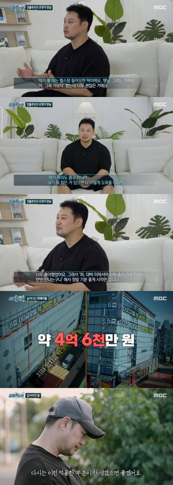 방송에서 그는 "2019년 한 지인이 A씨를 소개해줬다. 서울 강남구 논현동의 한 건물을 봤는데 너무 괜찮아서 임대 계약했다. A씨가 저한테 'TV에서 많이 봤던 팬이다. 10년, 20년 오래 해서 돈 만이 벌어라. 힘든 거 있으면 도와주겠다'고 하더라. 그때 너무 좋았다. 저도 이제서야 정말 좋은 건물주를 만났다고 생각해서 기분 좋게 시작했다"고 말했다.