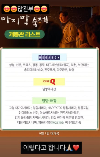 윤혜진은 1일 개봉 이틀을 앞둔 영화 '마지막 숙제'의 개봉 영화관 리스트를 공개하고 "많관부"라고 멘트를 덧붙였다.