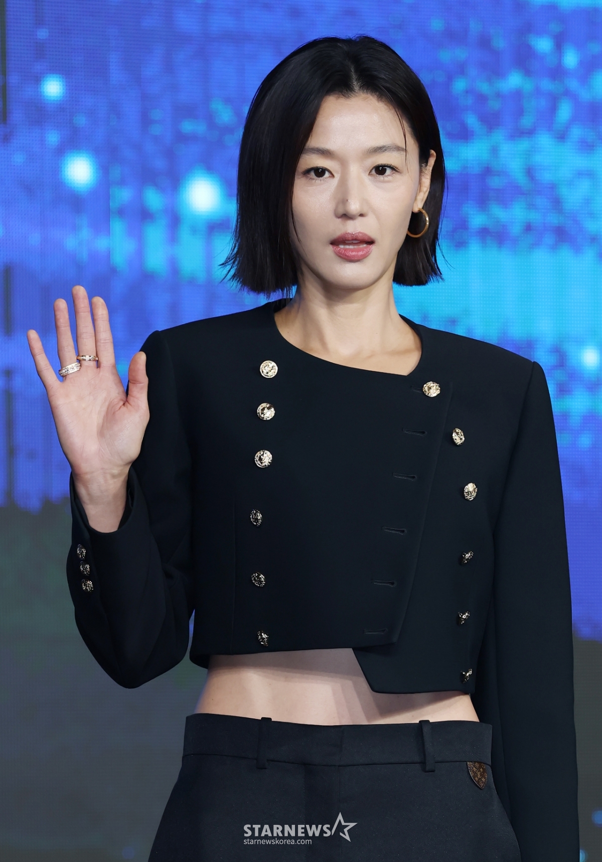 배우 전지현이 2일 오전 서울 포시즌스 호텔에서 진행된 디즈니+ 오리지널 시리즈 '북극성' 제작발표회에 참석해 포즈를 취하고 있다.