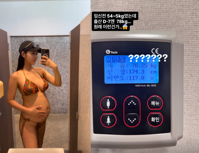 유다연은 2일 "임신 전 54-5kg이었는데 출산 D-7엔 78kg. 원래 이런건가"라는 문구와 함께 자신의 몸무게 측정 결과를 공개했다.
