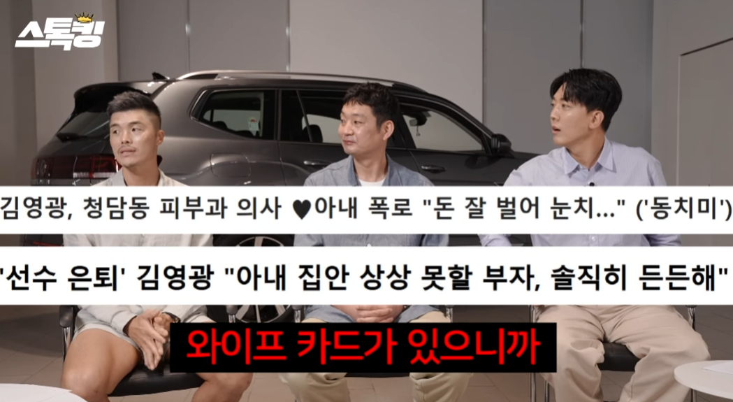 이날 김영광은 K리그 레전드 골키퍼이자 30대 이상 차량 보유 경력자로 소개됐다. 김영광은 "자동차 살때나 수리할 때 다 나한테 연락이 온다. 그러면 내가 다 연결해주고 견적서도 받으면 다 봐준다"라고 말했다. 이어 "3년 정도 K리그 최고 연봉을 찍을 때라 그때는 여유가 있었다"라고 말했다.