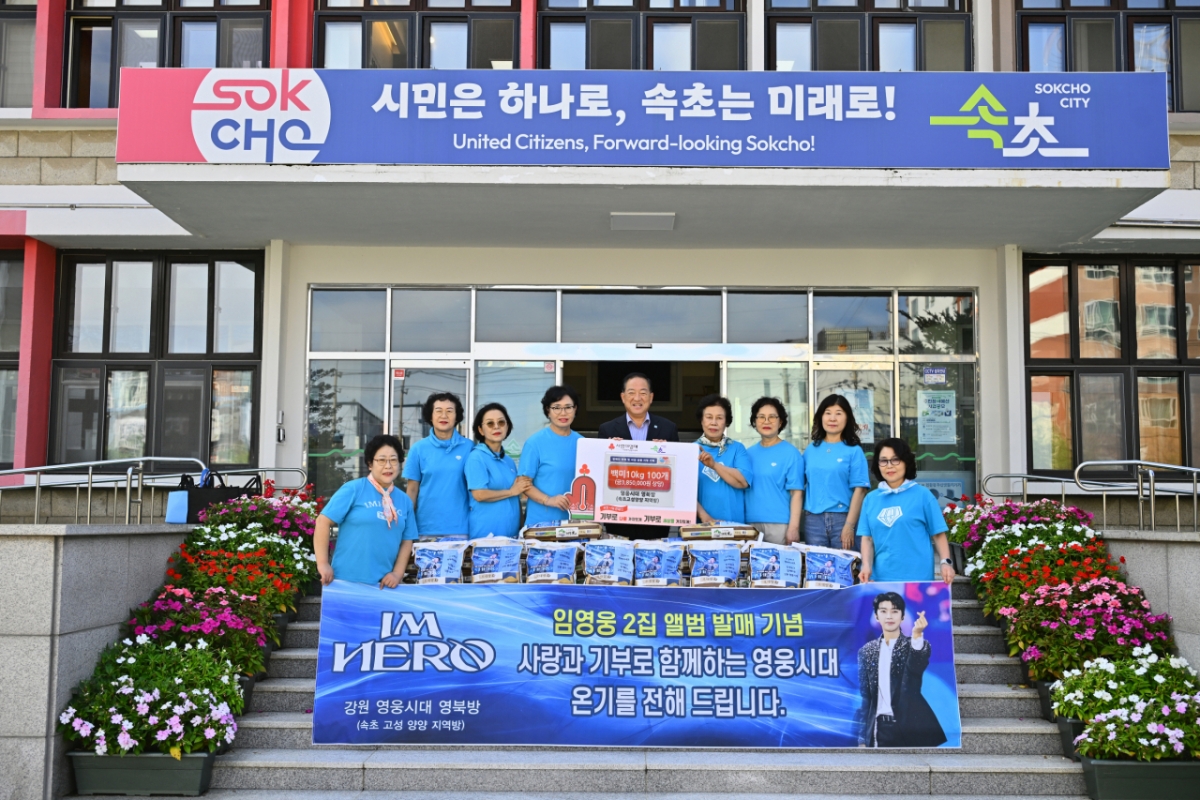 임영웅 팬클럽 '강원 영웅시대 영북방(속초·고성·양양 지역방, 방장 백남희)'은 2일 속초시청을 방문, 속초지역 장애인단체와 시설, 속초시지역사회보장협의체에 전달할 385만원 상당 10㎏들이 쌀 100포를 기탁했다.