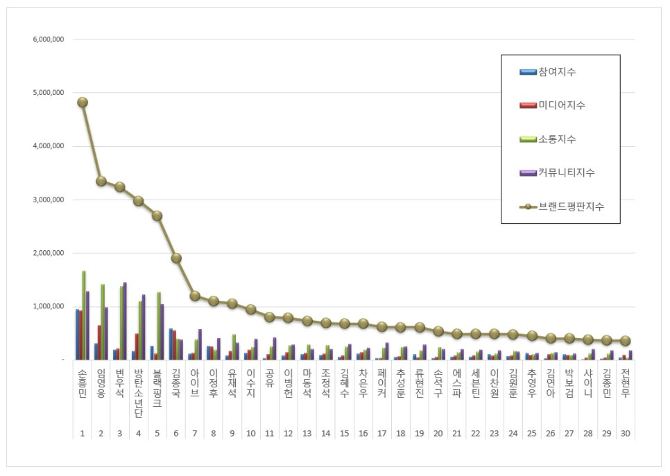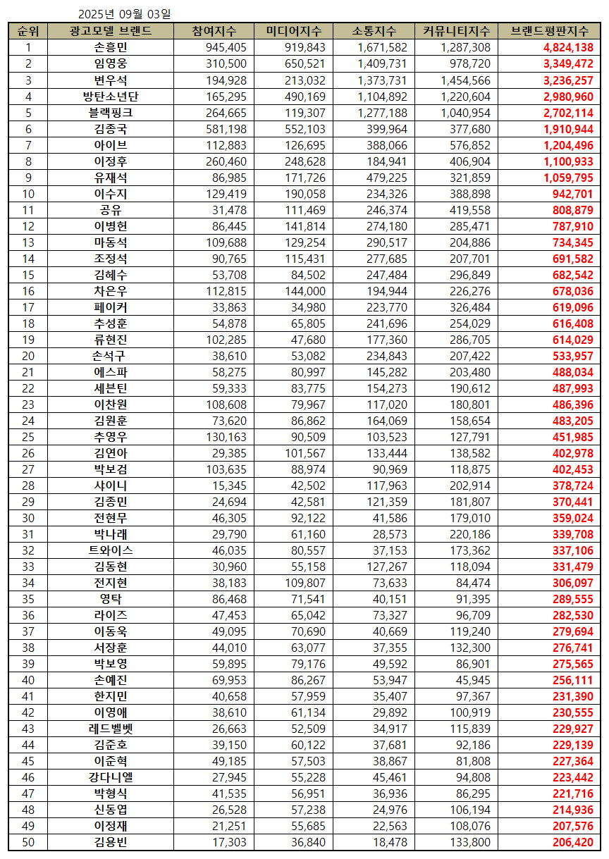 2025년 9월 광고모델 브랜드평판 30위 순위는 손흥민, 임영웅, 변우석, 방탄소년단, 블랙핑크, 김종국, 아이브, 이정후, 유재석, 이수지, 공유, 이병헌, 마동석, 조정석, 김혜수, 차은우, 페이커, 추성훈, 류현진, 손석구 , 에스파, 세븐틴, 이찬원, 김원훈, 추영우, 김연아, 박보검, 샤이니, 김종민, 전현무 순으로 분석됐다.