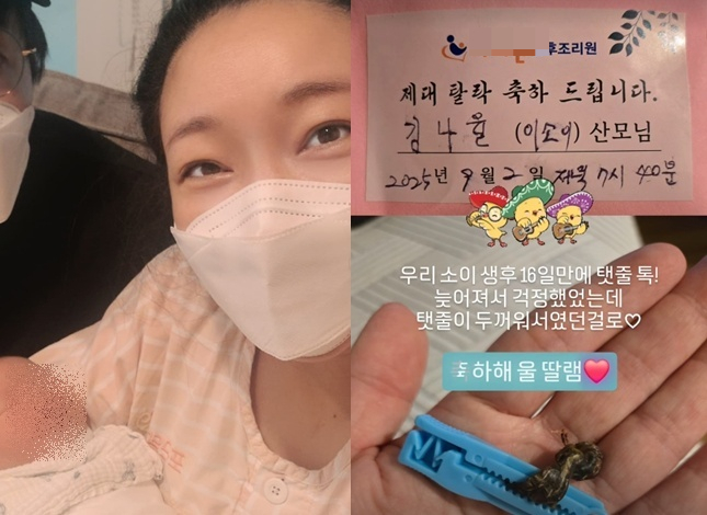 김나율은 지난 2일 자신의 인스타그램 계정을 통해 "우리 소이 생후 16일 만에 탯줄 톡. 늦어져서 걱정했었는데 탯줄이 두꺼워서였던 걸로. 축하해 울 딸램"이라는 글과 함께 한 장의 사진을 공개했다.