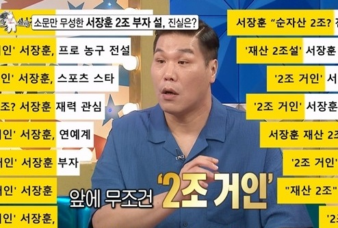 서장훈은 "제 기사가 나잖아요? 앞에 무조건 '2조 거인'이 붙는다"라며 억울함을 호소했다. 게다가 소문을 믿는 사람들이 있어 돈을 빌려달라고 회사에까지 연락한다며, "뭘 해서 2조를 벌 수가 있냐고 내가!"라고 울분을 토해냈다.