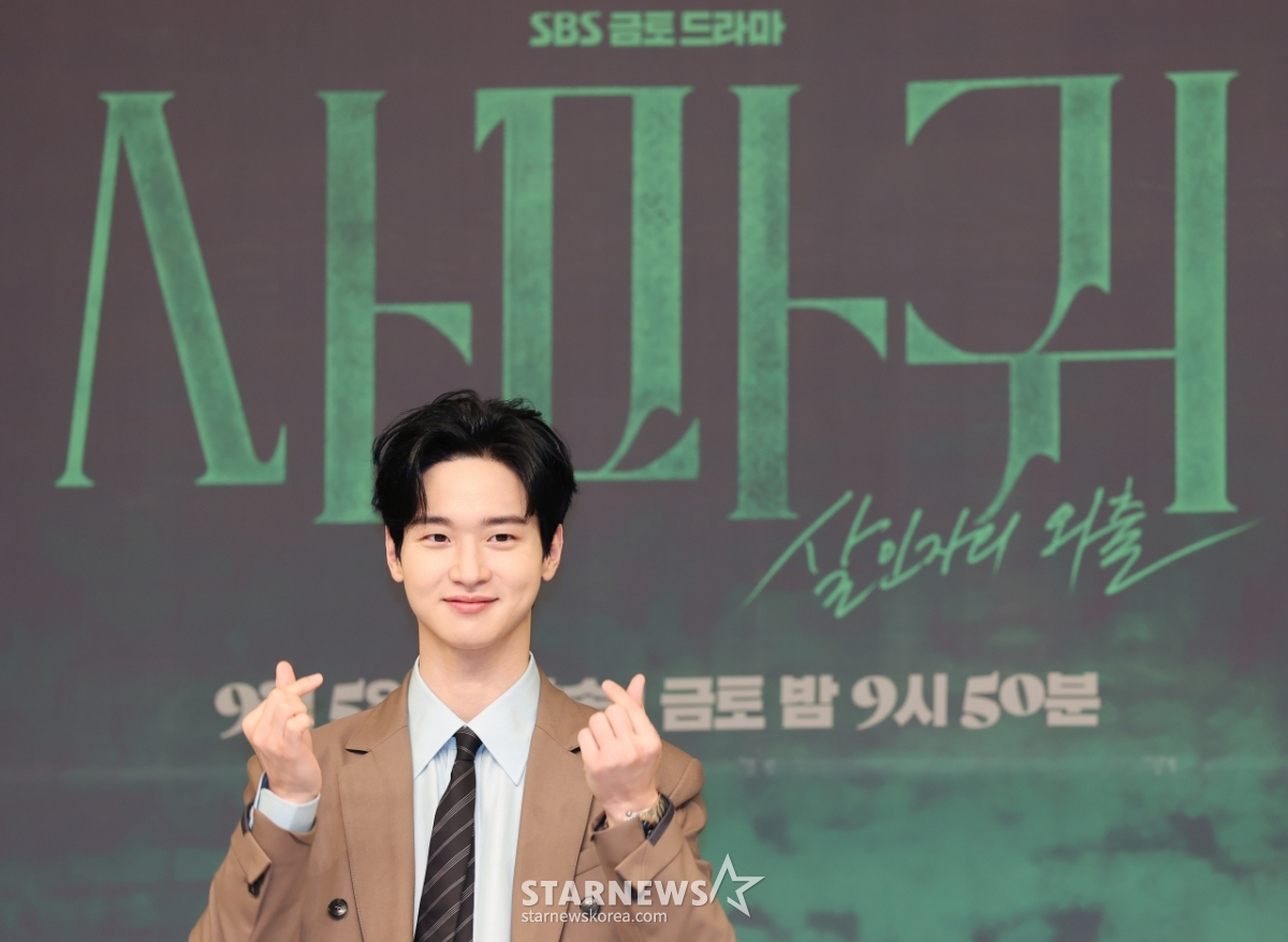 배우 장동윤이 4일 오전 서울 양천구 SBS 목동사옥에서 진행된 SBS 금토드라마 '사마귀: 살인자의 외출' 제작발표회에 참석해 포즈를 취하고 있다.