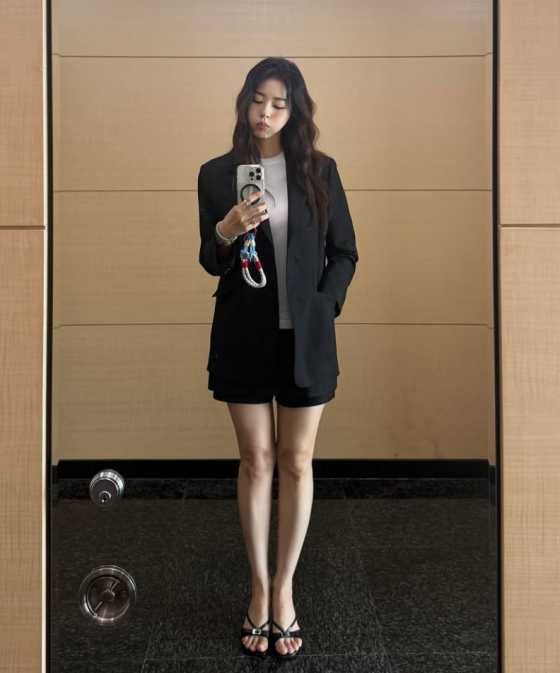 또 다른 사진 속 그는 검은색 재킷에 반바지를 조합해 한층 도회적인 매력을 강조했다.