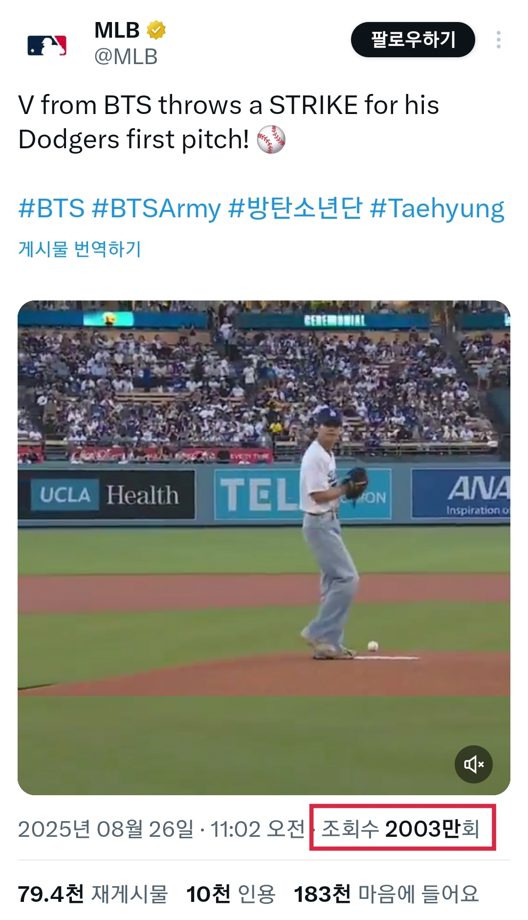 방탄소년단(BTS) 뷔의 시구 영상이 MLB 공식계정에서 2000만 조회수를 기록하며 여전히 뜨거운 관심을 받고 있다.