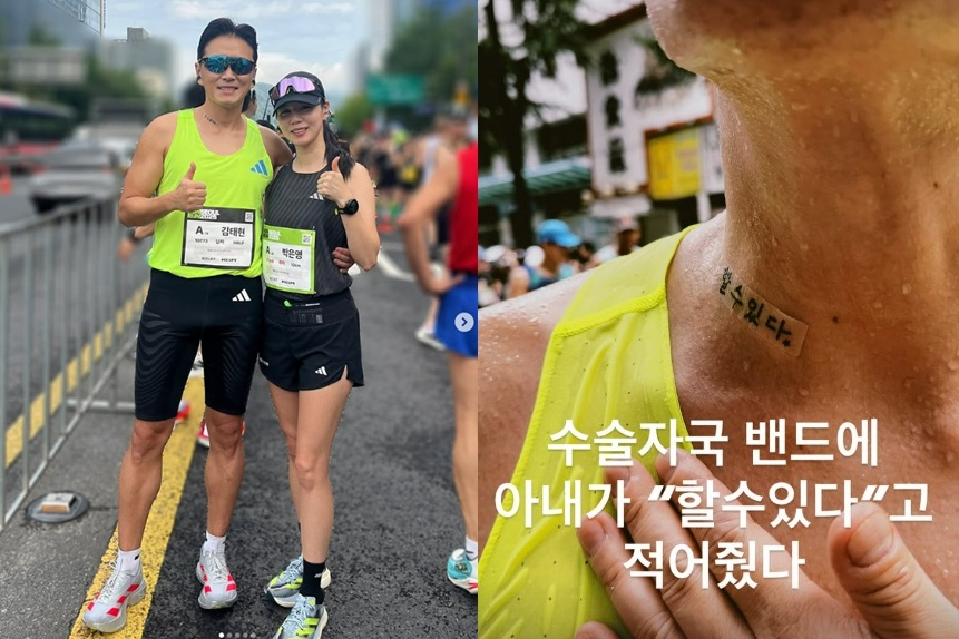 진태현은 갑상선암 수술 76일 차에 박시은과 함께 '2025 런 서울 런' 러닝대회에 도전한 인증샷과 목에 '할 수 있다'라고 글씨를 적은 밴드를 붙인 모습을 공개했다. 그는 "수술자국 밴드에 아내가 '할 수 있다'고 적어줬다"라고 설명했다.