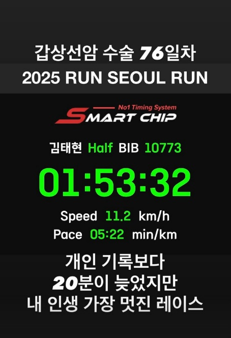 그는 "아내는 10k 저는 하프 하반기 첫 대회였습니다. 아내는 본래의 10k 기록 보다 6분 늦은 55분, 저는 본래 하프 기록보다 20분 늦은 1시간 53분에 멋지게 골인했습니다"라고 전했다.