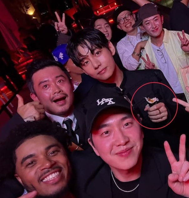 공개된 사진에서 뷔는 와인이 어울리는 분위기의 파티에서 썰지 않은 김밥을 통째로 손에 꼭 쥐고 무표정한 얼굴로 찍혀 엉뚱한 매력을 발산했다. 뷔는 김밥을 먹다가 사진을 찍자는 말에 급하게 나온 듯 김밥에는 한 입 베어 문 자국이 있어 웃음을 자아냈다.