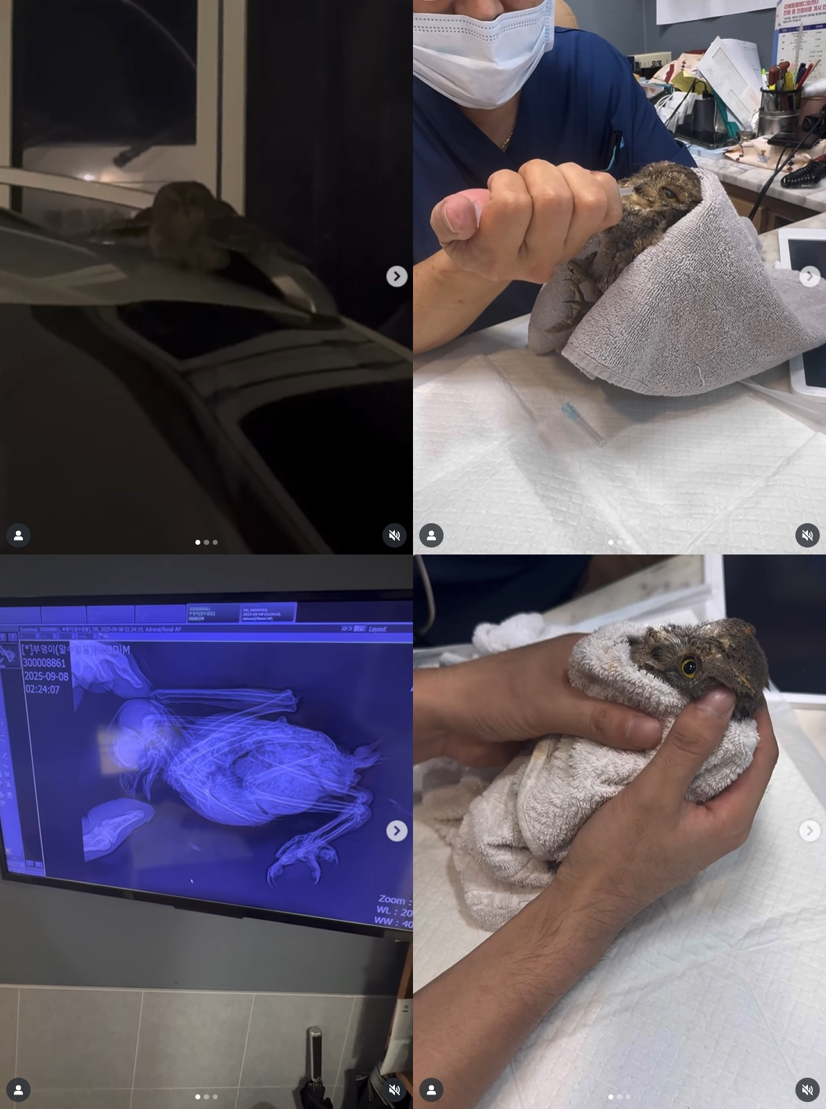 이어 홍진영은 "처음엔 신기해서 곧 날아가겠지 싶었는데, 가까이 다가가 보니 상태가 너무 안 좋아 보이더라고요. 혹시 탈수 증상일까 싶어 물을 떠서 조심스레 가져가 봤는데, 부엉이가 놀라 도로 쪽으로 날개짓을 하더니 제대로 날지도 못하고 도로 한가운데서 기어가다 멈춰 서버렸습니다. 야생동물보호센터는 새벽이라 연락이 안 되고, 도로에 두고 가자니 차에 치일까 걱정돼 일단 병원으로 데려가기로 했습니다. 그런데 서울 시내 24시 동물병원 스무 군데 넘게 전화를 돌렸는데도 다들 부엉이 진료는 어렵다고 하시더라고요. 마지막이라는 심정으로 전화를 건 병원에서 '데려오라'고 해주셨을 때 정말 얼마나 안도했는지 모릅니다"라며 직접 찍은 부엉이 동영상도 공개했다.