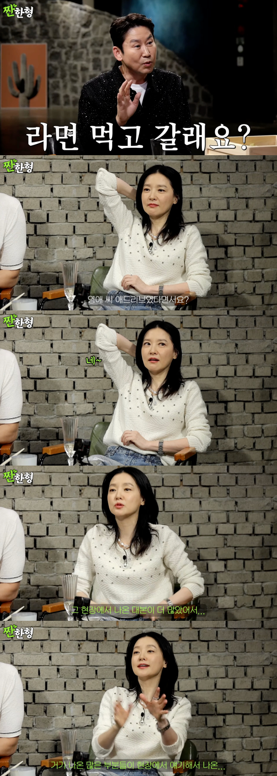 이날 신동엽은 이영애를 향해 "영화 '봄날은 간다' 속 '라면 먹고 갈래요?'라는 대사가 애드리브였다는 말을 들었는데 진짜냐"고 물었다.