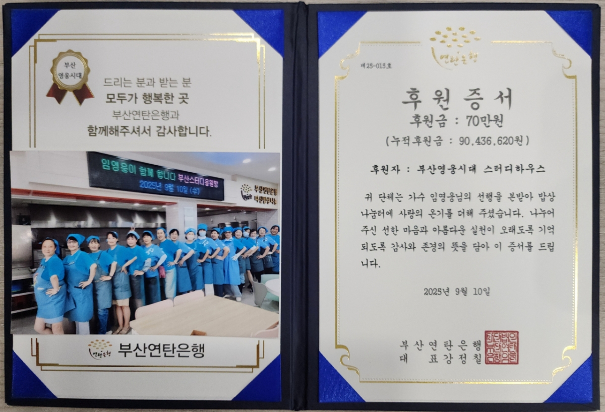 부산영웅시대 스터디하우스는 미처 손길이 닿지 않는 소외 된 곳을 찾아 매달 70만 원 기부와 조리 및 급식, 청소까지 하는 봉사 활동을 하고 있다. 밥상공동체에 5년째 49회 후원한 총 누적 후원금은 9043만 6620원이다.