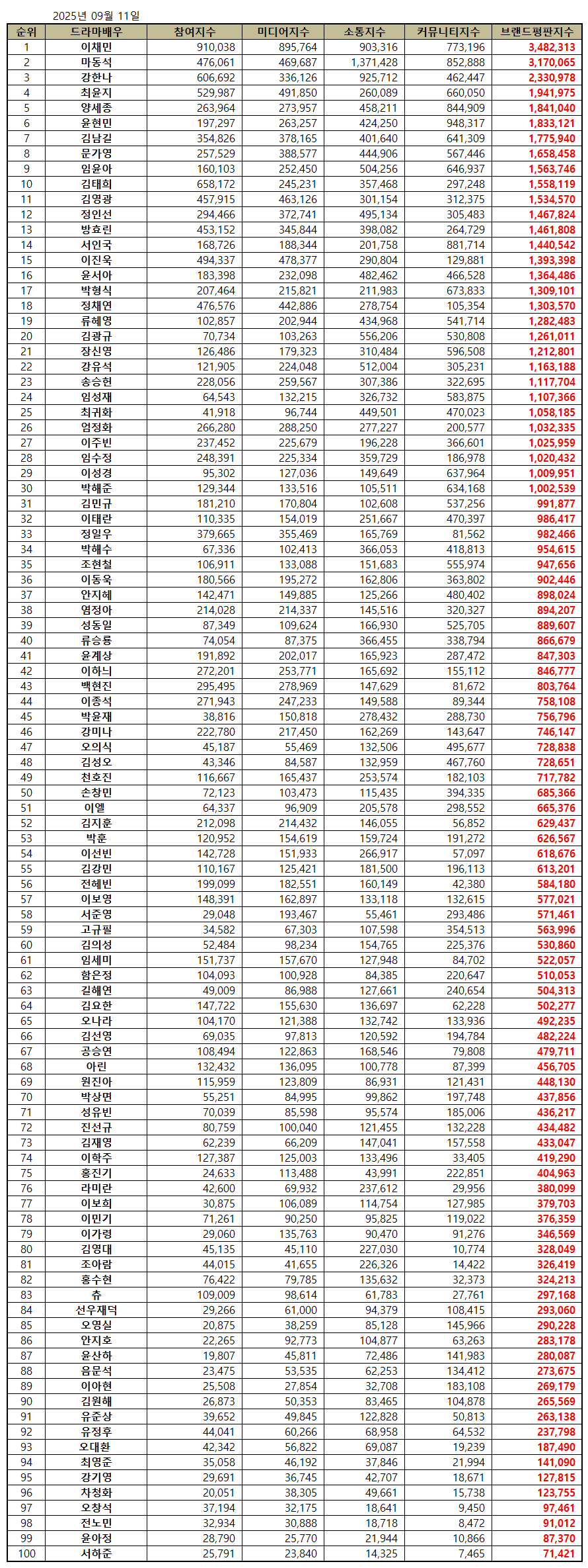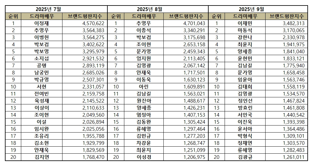 한국기업평판연구소는 2025년 8월 11일부터 2025년 9월 11일까지 방영한 드라마에 출연중인 배우 100명의 브랜드 빅데이터 81,744,771개를 소비자들의 브랜드 참여량, 미디어량, 소통량, 커뮤니티량으로 측정하여 브랜드평판 알고리즘으로 지수화했다. 지난 8월 드라마 배우 브랜드 빅데이터 59,998,725개와 비교하면 36.24% 증가했다.