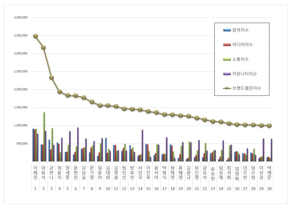 드라마 배우 브랜드평판 1위를 기록한 이채민 브랜드는 참여지수 910,038 미디어지수 895,764 소통지수 903,316 커뮤니티지수 773,196이 되면서 브랜드평판지수 3,482,313으로 분석됐다.